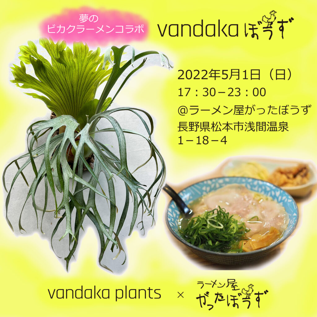 ビカクシダ vandaka plants バンダカ プランツ platycerium vandakaぼうず 長野 松本 浅間温泉 ラーメン がったぼうず 植物イベント 販売 コウモリラン アロイド 蘭 ビカクラーメンコラボ 夜営業