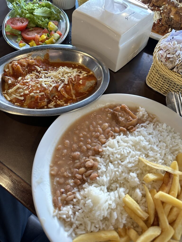 チキンの上にトマトソースとモッツァレラチーズがかかったものに、ごはん、豆、フライドポテトが付け合わせという豪華なランチです。