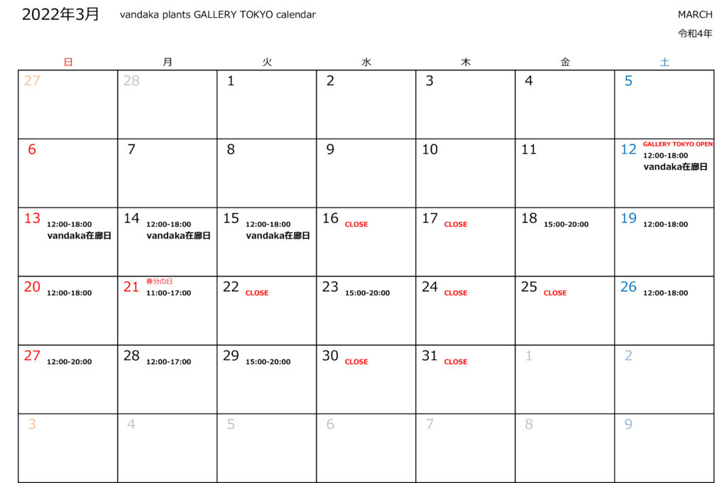 【営業日のお知らせ】vandaka plants GALLERY TOKYO 3月4月 投稿日: 2022年3月17日2022年4月12日 投稿者: vandakaplants vandaka plants GALLERY TOKYO 2022年3月4月の営業日のお知らせです。 カレンダーの内容に変更がある場合は、 都度こちらのブログやインスタグラムでお知らせしますので、 ご確認の上お越しください。 これからどんどん植物が楽しみな季節に突入です。 ギャラリーも楽しみな株を揃えてお待ちしております。 写真はGALLERY TOKYOカウンター付近。 夜もいい雰囲気ですが、昼の陽が差し込んでいるところもよい感じです。 @vandaka_plants @vandakaplants_gallerytokyo