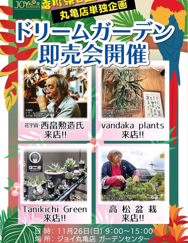 【イベント】ドリームガーデン 即売会 11月26日(日) 9:00 – 15:00 @香川・丸亀 投稿日: 2023年10月23日2023年11月7日 投稿者: vandakaplants 四国でのイベントです皆さん遊びに来てください! 11月26日(日) 9:00-15:00場所 ジョイ丸亀店 出店者花宇宙 @kunzo_nTanikichi Green高松盆栽vandaka plants @vandaka_plants @vandakaplants_official @vandakaplants_gallerytokyo